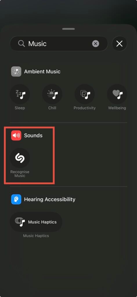 - Search for the keyword “Music” in the search and select “Recognise Music”.